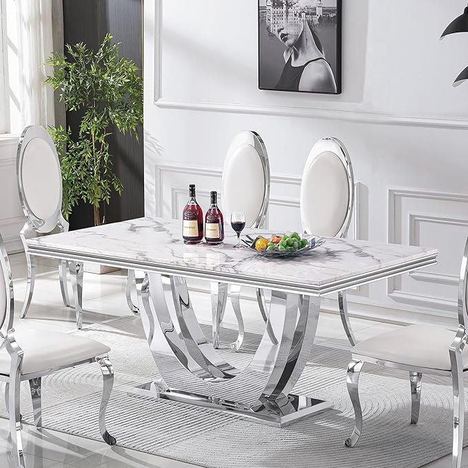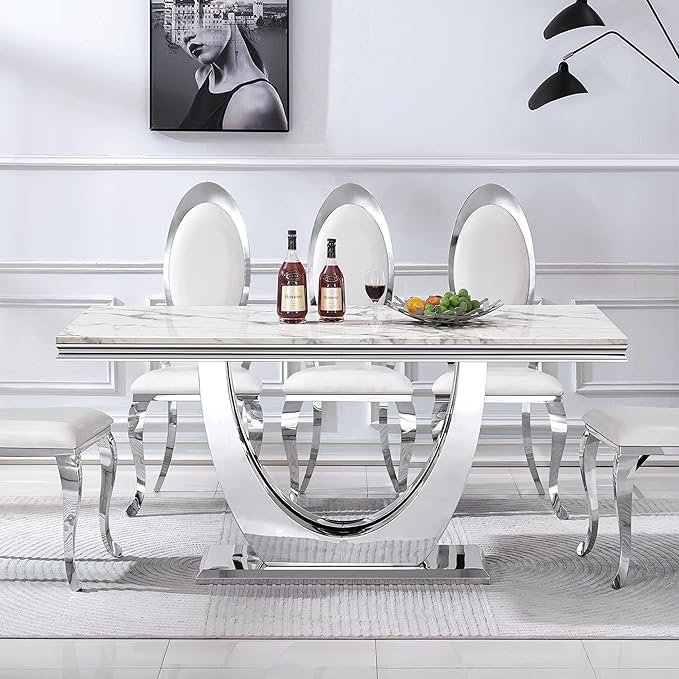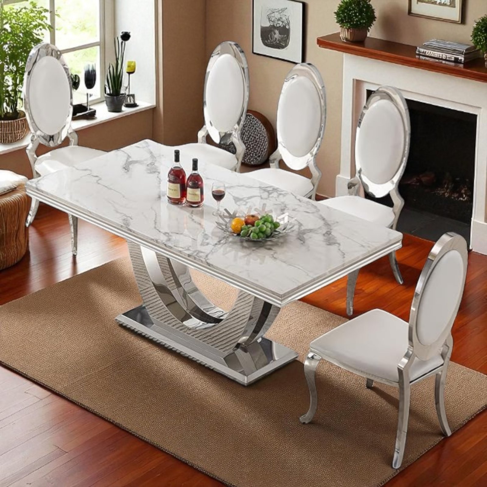 Introducing The Sterling, a dining table that exudes elegance and sophistication, redefining your dining space. Crafted with a fusion of luxurious materials and contemporary design, The Sterling is more than just a piece of furniture; it’s an invitation to unforgettable gatherings. The Sterling boasts a striking white composite marble tabletop, adding a touch of timeless beauty and natural elegance. This durable surface is not only visually appealing but also easy to clean and maintain, ensuring years of enjoyment. Beneath the captivating marble lies a sturdy foundation of sleek, U-shaped stainless steel legs. This unique design adds a touch of modern flair while providing exceptional stability and support. The gleaming silver finish complements the marble top perfectly, creating a harmonious and sophisticated aesthetic. Accompanying this stunning table are six exquisitely designed chairs, each crafted with a stainless steel frame and plush white upholstery. The chairs feature sleek and stylish legs that echo the table’s modern design, while the comfortable cushioning ensures that your guests will linger long after the meal is over.