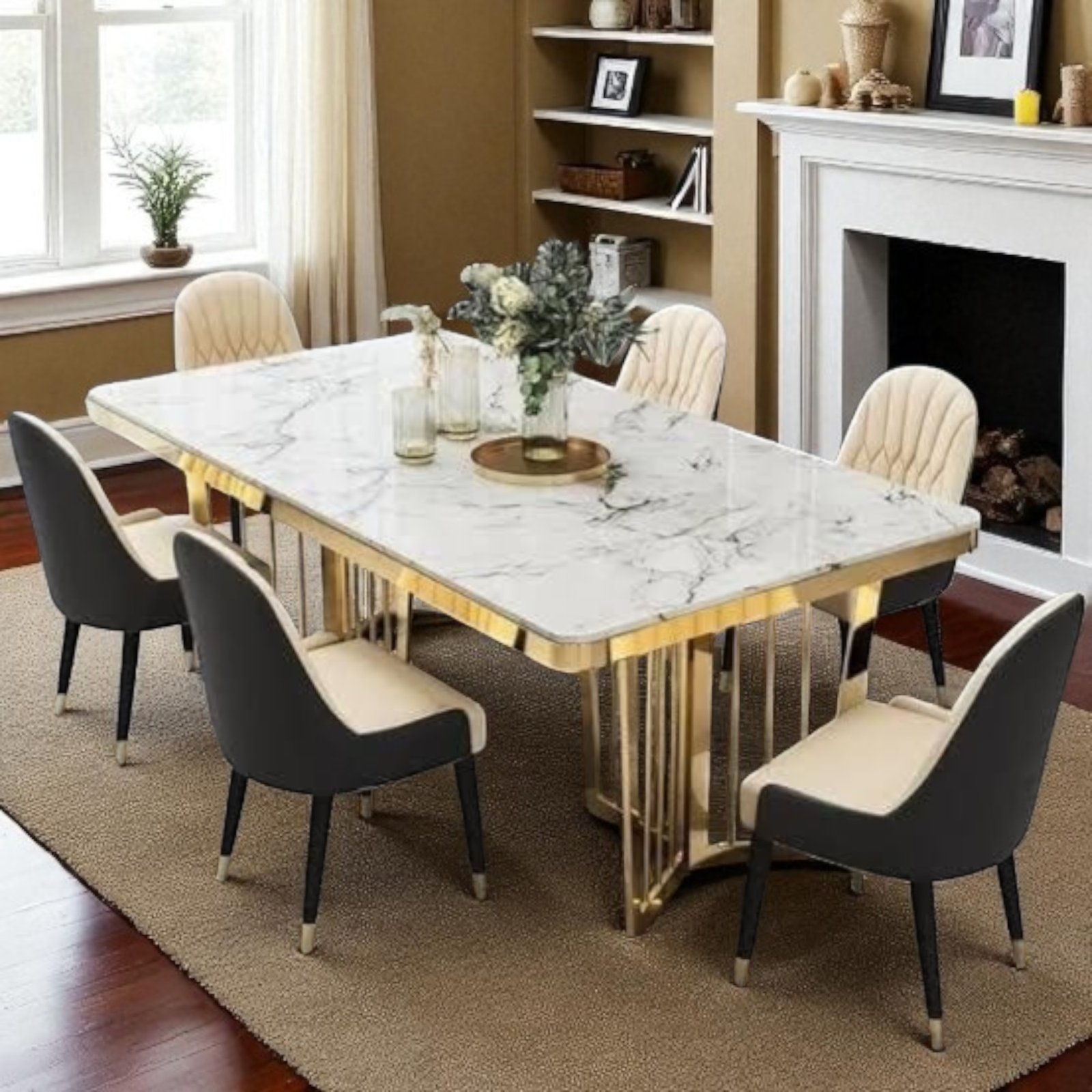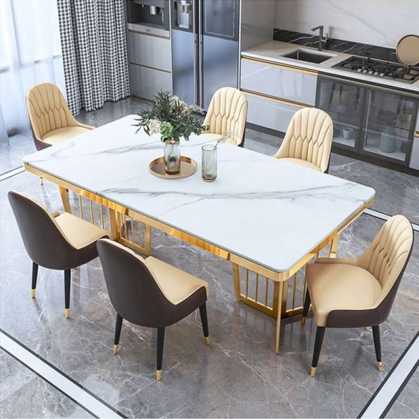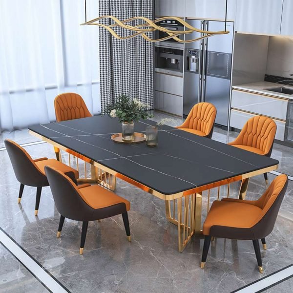 Immerse your dining space in the captivating fusion of modern luxury with The Stainless Steel Star Dining Table. This exquisite piece is more than just furniture; it’s a statement, a conversation starter, and a gateway to countless memorable gatherings. Crafted with the finest materials, boasts a gleaming stainless steel base, its intricate geometric design reminiscent of a celestial constellation. Atop this foundation rests a luxurious composite marble surface, its veins swirling like whispered secrets, adding depth and character to the table’s overall aesthetic. This set comes with six luxurious chairs, thoughtfully designed for both comfort and style. Each chair features plush upholstered seats, ensuring a cozy and relaxing dining experience. The metal cone-shaped legs with a sleek black finish add a contemporary charm, while ensuring stability and durability.